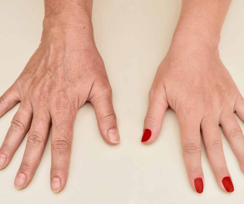| Prominent veins and bones | Fuller, youthful hand contours |
